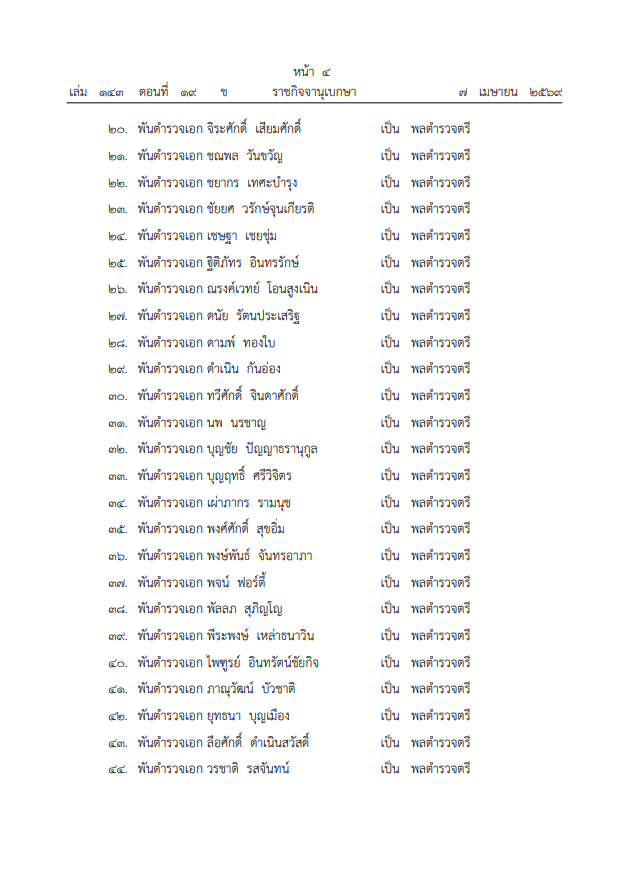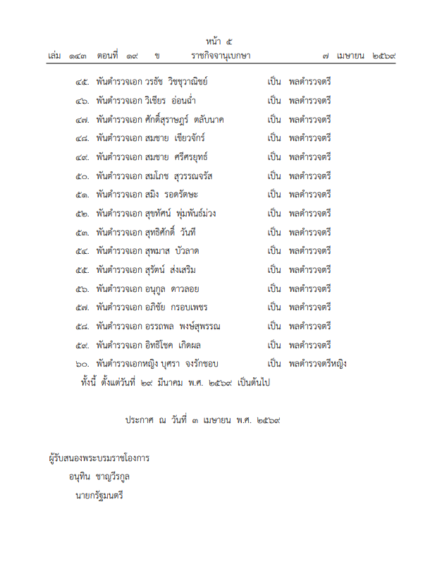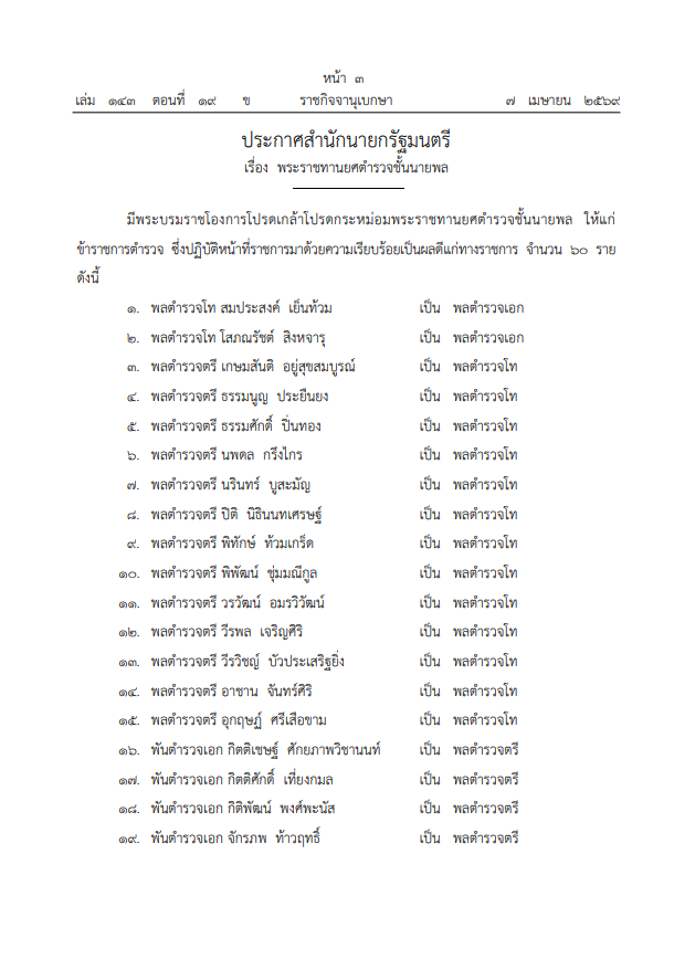วันที่ 7 เมษายน 2569 ทางเว็บไซต์ ราชกิจจานุเบกษา เผยแพร่ประกาศสำนักนายกรัฐมนตรี เรื่อง แต่งตั้งข้าราชการตำรวจ โดยมีพระบรมราชโองการโปรดเกล้าโปรดกระหม่อม พระราชทานยศตำรวจชั้นนายพล แก่ข้าราชการตำรวจที่ปฏิบัติหน้าที่ด้วยความเรียบร้อยและเกิดผลดีต่อทางราชการ รวมทั้งสิ้น 60 ราย ดังนี้