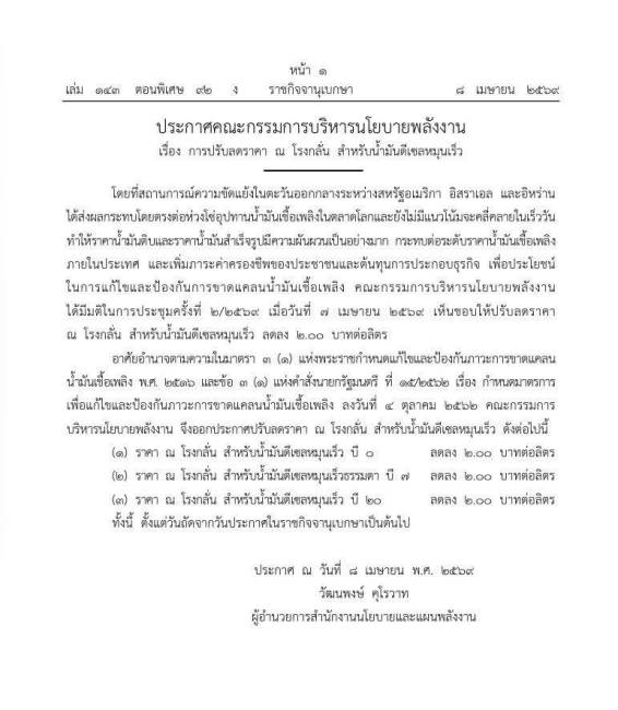 ประกาศระบุว่า โดยที่สถานการณ์ความขัดแย้งดังกล่าวยังไม่มีแนวโน้มคลี่คลายในเร็ววัน ส่งผลโดยตรงต่อเสถียรภาพด้านพลังงาน คณะกรรมการบริหารนโยบายพลังงาน จึงมีมติในการประชุมครั้งที่ 2/2569 เมื่อวันที่ 7 เมษายน 2569 เห็นชอบให้ปรับลดราคา ณ โรงกลั่น สำหรับน้ำมันดีเซลหมุนเร็ว เพื่อบรรเทาผลกระทบและป้องกันการขาดแคลนน้ำมันเชื้อเพลิงในประเทศ
