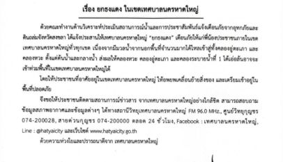 Read More »ด่วนที่สุด! เทศบาลนครหาดใหญ่ ประกาศยกธงแดงทั้งเมือง เมื่อวันที่ 15 สิงหาคม 2568 เพจ เทศบาลนครหาดใหญ่ ได้โพสต์แถลงการณ์การณ์เกี่ยวกับสถานการณ์น้ำท่วมในพื้นที่ ระบุว่า แถลงการณ์ฉบับที่ 4 เรื่อง ยกธงแดง ในเขตเทศบาลนครหาดใหญ่ เนื่องจากมีมวลน้ำจากนอกพื้นที่จำนวนมากได้ไหลเข้าสู่ ทั้งคลองอู่ตะเภา และคลองหวะ ตั้งแต่ต้นน้ำและกลางน้ำ ส่งผลให้คลองหวะ คลองอู่ตะเภา และคลองระบายน้ำที่ 1 ได้เอ่อล้น อาจจะเข้าท่วมพื้นที่ในเขตเทศบาลนครหาดใหญ่ได้ โดยให้ประชาชนที่อาศัยในเขตเทศบาลนครหาดใหญ่ ให้อพยบเคลื่อนย้ายสิ่งของและเตรียมเข้าอยู่ในพื้นที่ปลอดภัย ขอบคุณข้อมูล/ภาพ : เฟซบุ๊ก เทศบาลนครหาดใหญ่